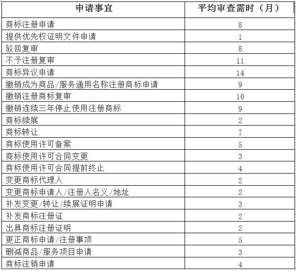 为了方便广大商标申请人办理各种商标业务,我们运用国方商标大数据对商标局、商评委近期各种商标申请事宜的平均审查需时进行了统计,统计结果如下: